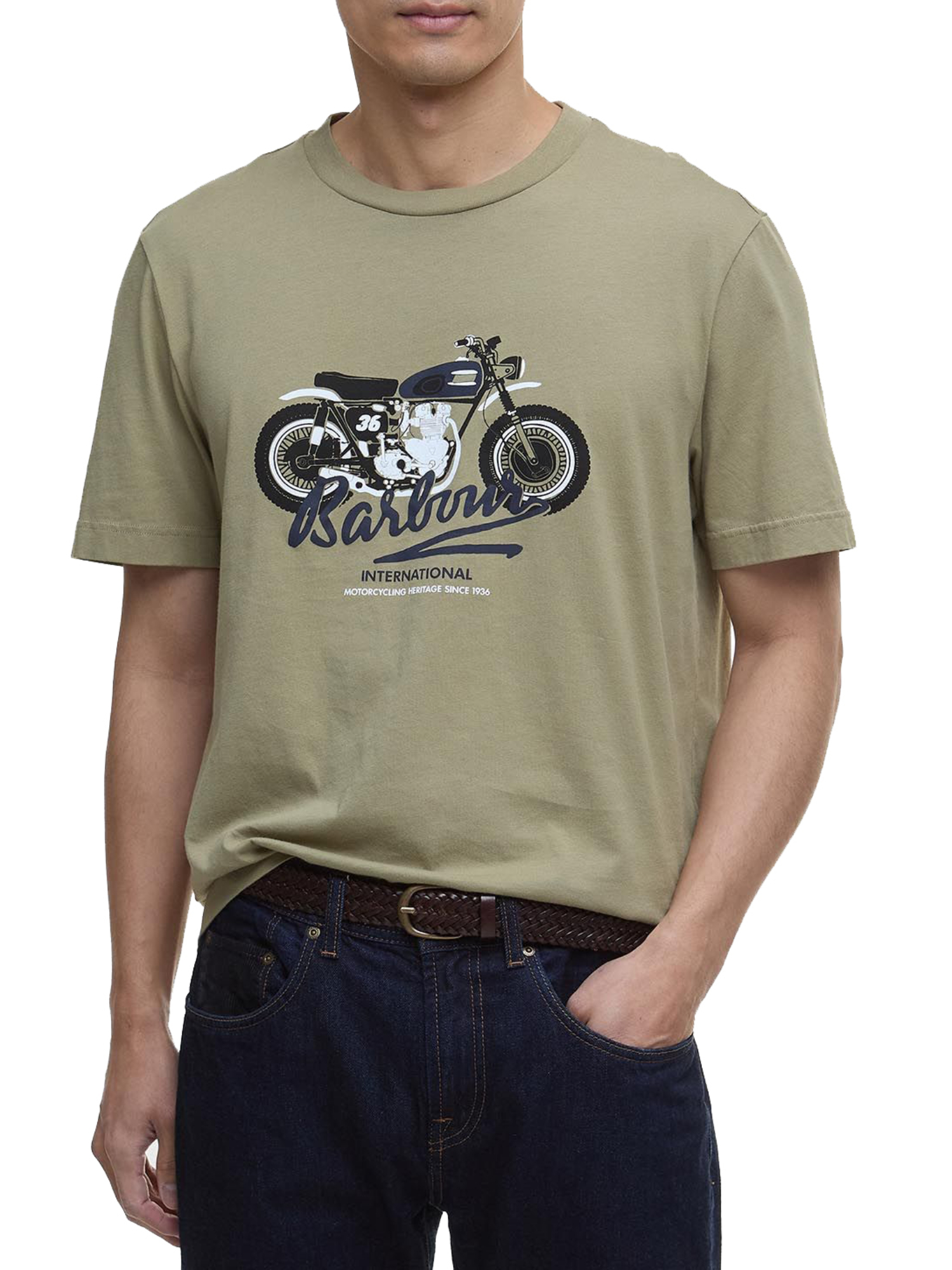 - Stampa grafica di una motocicletta con lettering Barbour International, tributo all’heritage del brand