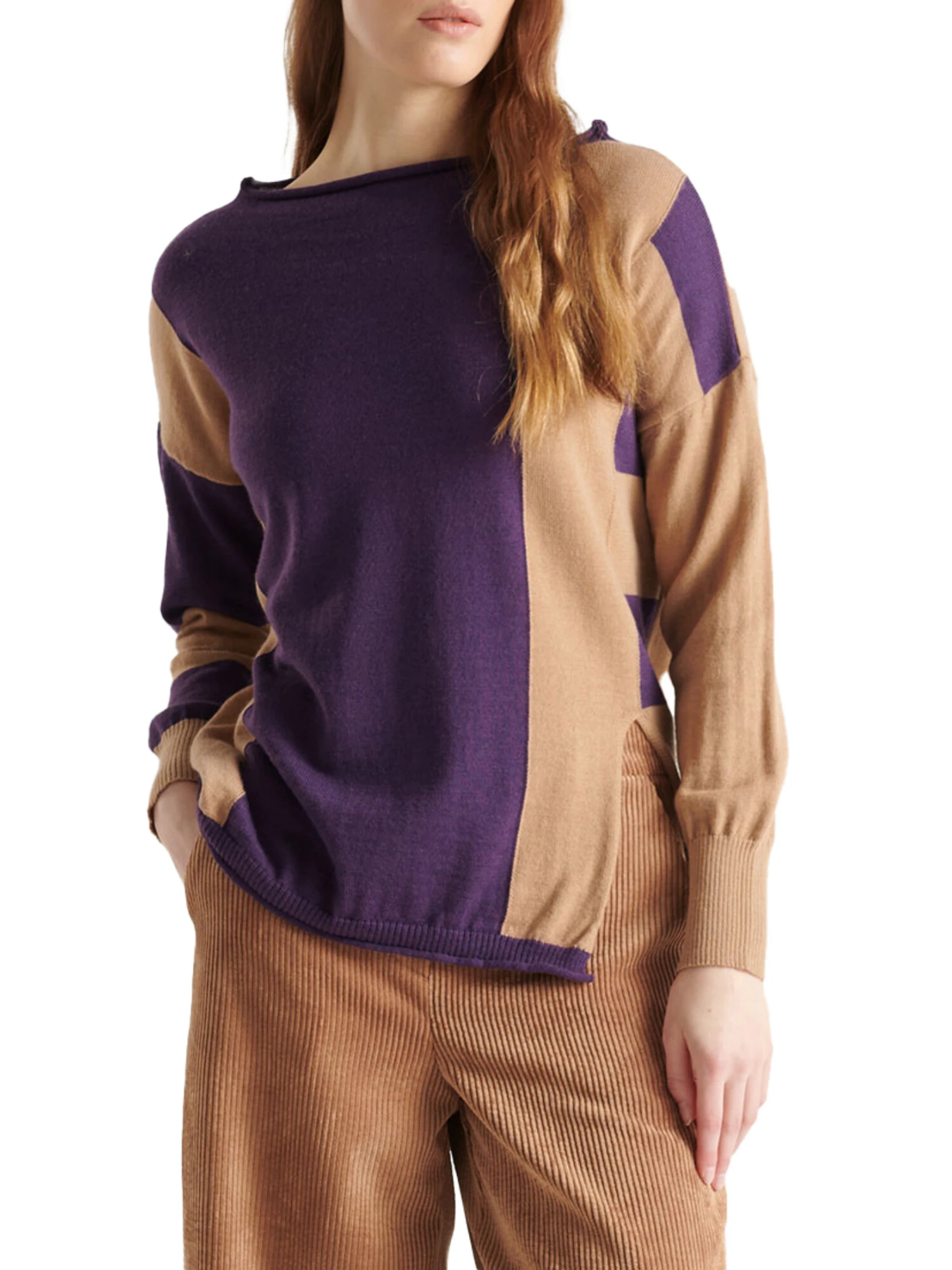 La maglia Crochè con scollo a barca bicolor da donna, in un elegante misto lana viola, è un capo originale e raffinato. Lo scollo a barca aggiunge femminilità, mentre il design bicolore dona un tocco di modernità. Realizzata in un tessuto morbido e caldo, questa maglia è ideale per le giornate più fresche, perfetta da abbinare a look casual chic o a outfit più eleganti. Un capo versatile che unisce stile e comfort in un'unica soluzione.