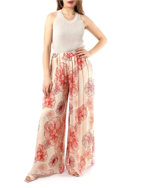 Realizzati in un mix prezioso di viscosa e seta (70% viscosa, 30% seta), questi pantaloni si distinguono per la stampa floreale macro nei toni del rosso e del corallo su base avorio. La silhouette ampia e fluida cade morbida lungo la gamba, valorizzando il movimento e regalando un’allure sofisticata e rilassata. La vita elasticizzata con fascia arricciata garantisce una vestibilità comoda e femminile.