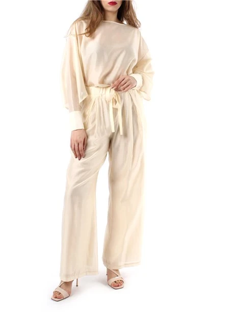 Con una linea ampia e fluida, questi pantaloni si distinguono per l’elastico in vita e il fiocco regolabile, che valorizzano la silhouette senza costrizioni. La vita alta e leggermente arricciata crea un delicato movimento che accompagna ogni passo. Il tessuto in mussola – composto all’85% da lyocell e al 15% da poliestere – è soffice, traspirante e leggermente trasparente, perfetto per look leggeri dal fascino etereo.