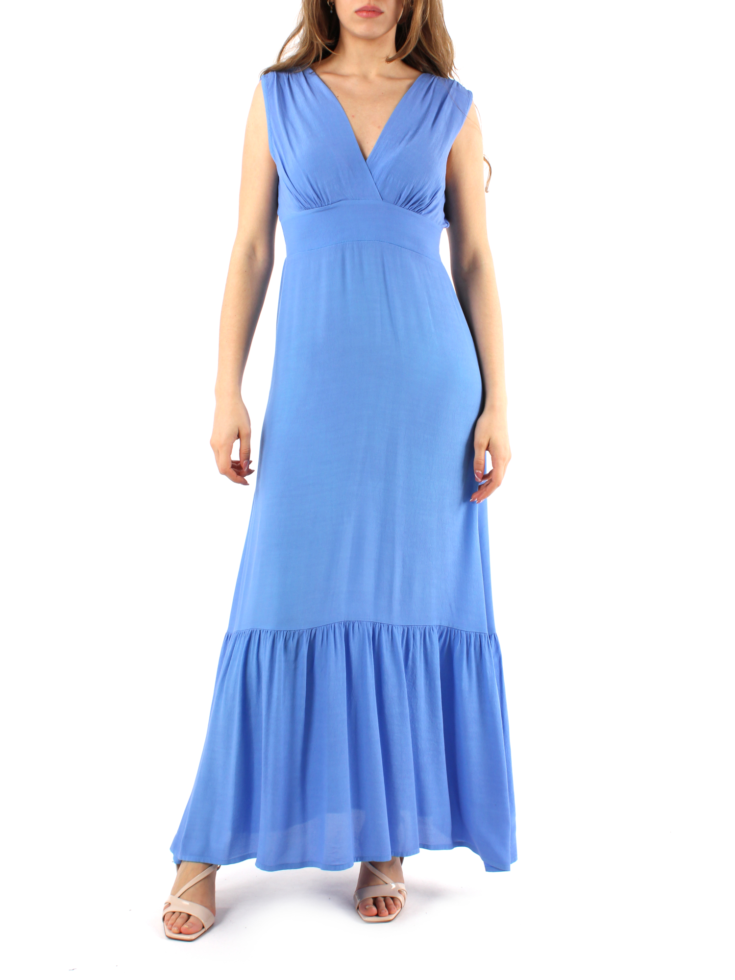 Il taglio a impero slancia la figura grazie allo scollo a V profondo e alle delicate arricciature sul corpino. La parte inferiore dell’abito si apre in una balza leggera che dona volume e morbidezza alla silhouette. Il tessuto in creponne 100% viscosa, dalla texture leggermente increspata, conferisce un movimento dinamico e un tocco etereo ad ogni passo. Il colore azzurro cielo lo rende perfetto per i mesi più luminosi, evocando una femminilità pura e sofisticata.