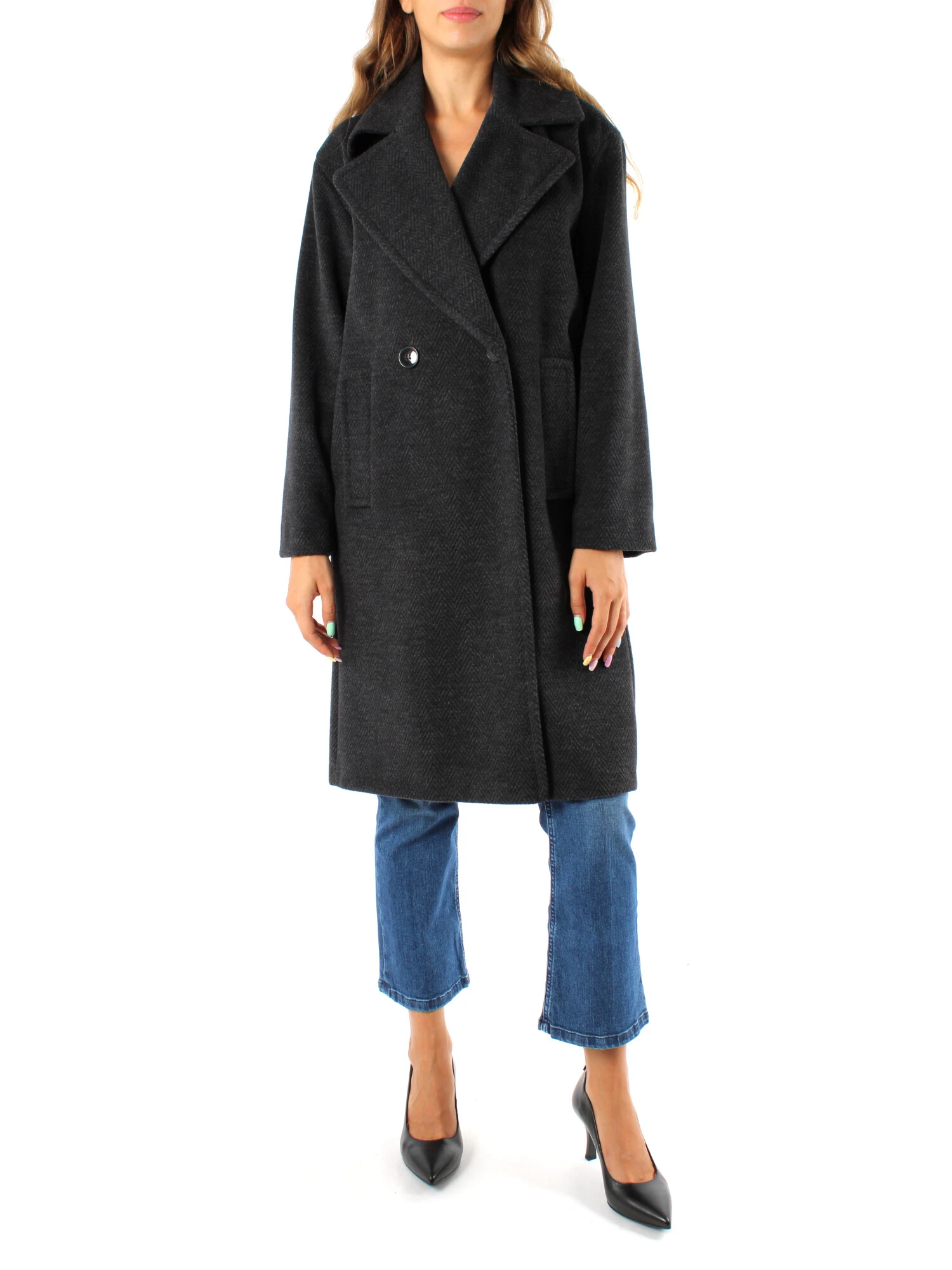 Questo elegante cappotto lungo in jersey Chevron della collezione Emme di Marella presenta un design pratico con due bottoni frontali e tasche laterali a filetto. La combinazione di stile classico e comfort lo rende perfetto per l'uso quotidiano, offrendo versatilità per abbinamenti sia formali che casual. Un'aggiunta sofisticata ed essenziale al guardaroba autunnale e invernale.