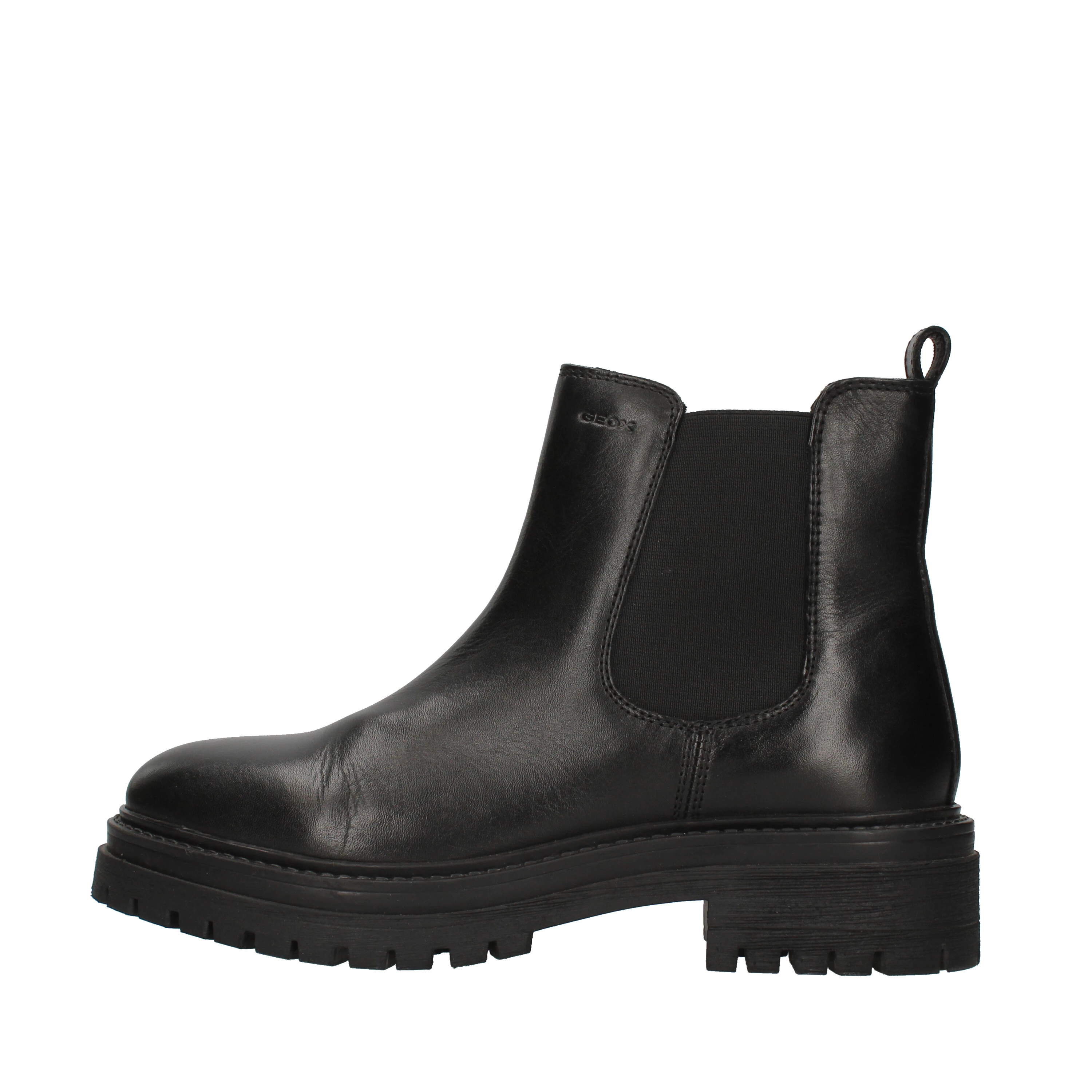 Tronchetti donna Geox in pelle nera. La suola robusta e i materiali con cui è realizzata la tomaia garantiscono per questa calzatura morbidezza e resistenza per un comfort ottimale e duraturo. Impreziositi da celastici laterali che ne facilitano la calzata. Le linee pulite e il taglio moderno gli conferiscono uno stile glamour ed elegante che li rende versatili per ogni occasione.
