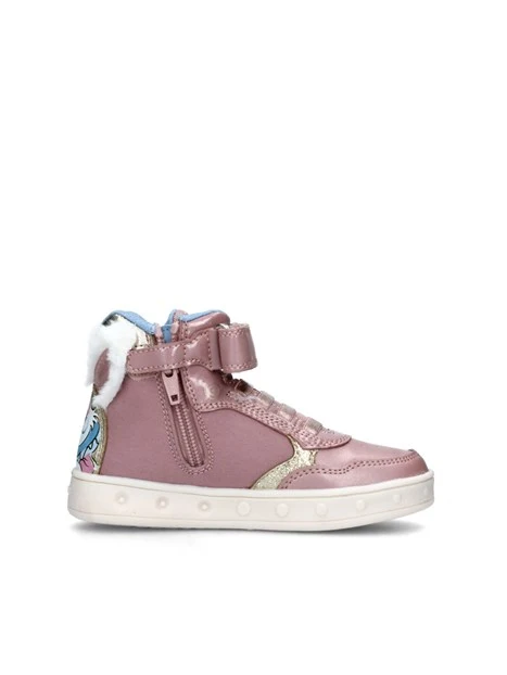 Sneakers alte Geox Junior realizzate in camoscio e simil pelle. L'apertura con strappi ne facilita la calzata ai più piccoli. La tomaia è impreziosita dalla stampa dell'amato personaggio Disney Minnie. La suola in gomma rigida offre un comfort ottimale durante tutta la giornata. Un accessorio immancabile nella collezione di tutte le bambine amanti della Disney.