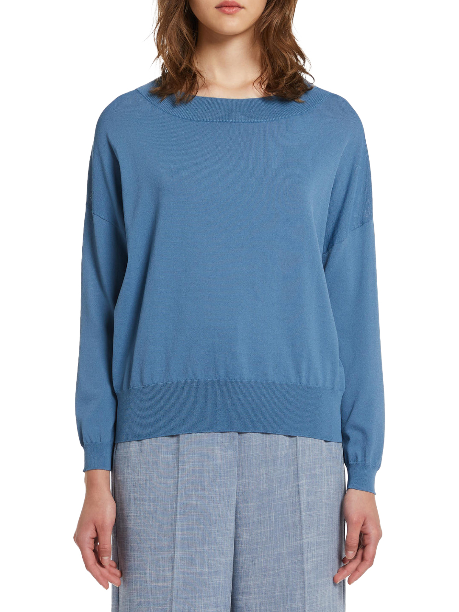 Con il suo scollo a barchetta, questa maglia esalta il décolleté con discrezione e raffinatezza. Le maniche lunghe con spalle basse aggiungono un tocco rilassato e moderno, mentre i bordi rifiniti valorizzano la silhouette con un tocco di struttura. Realizzata in 65% viscosa e 35% poliammide, è un capo morbido e piacevole sulla pelle, perfetto per la mezza stagione.