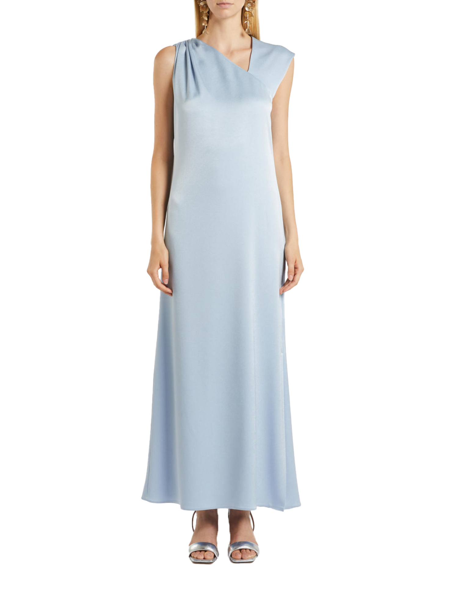 L’abito GRAFFA si distingue per il suo scollo asimmetrico, caratterizzato da un raffinato arriccio sulla spalla destra e una linea ad aletta sulla manica sinistra, che aggiunge un dettaglio architettonico alla struttura. Il fit dritto segue delicatamente la figura, valorizzandola senza costrizioni. Realizzato in satin tecnico, un tessuto fluido e luminoso che dona una lucentezza sofisticata, questo abito è composto per il 82% da triacetato e per il 18% da poliestere, garantendo un’ottima vestibilità e una texture leggermente strutturata.