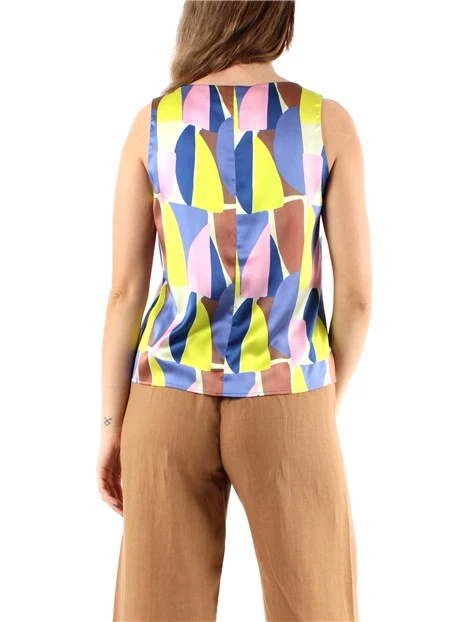 Realizzato in 92% seta e 8% elastan, questo top si distingue per il suo tessuto pregiato, morbido al tatto e leggero sulla pelle. La seta stampata presenta una combinazione di colori vivaci e moderni, perfetta per illuminare qualsiasi look con un tocco grafico e dinamico.