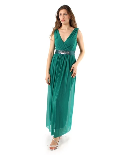 VESTITO LUNGO IN TULLE CON CINTURA RICAMATA DONNA VERDE