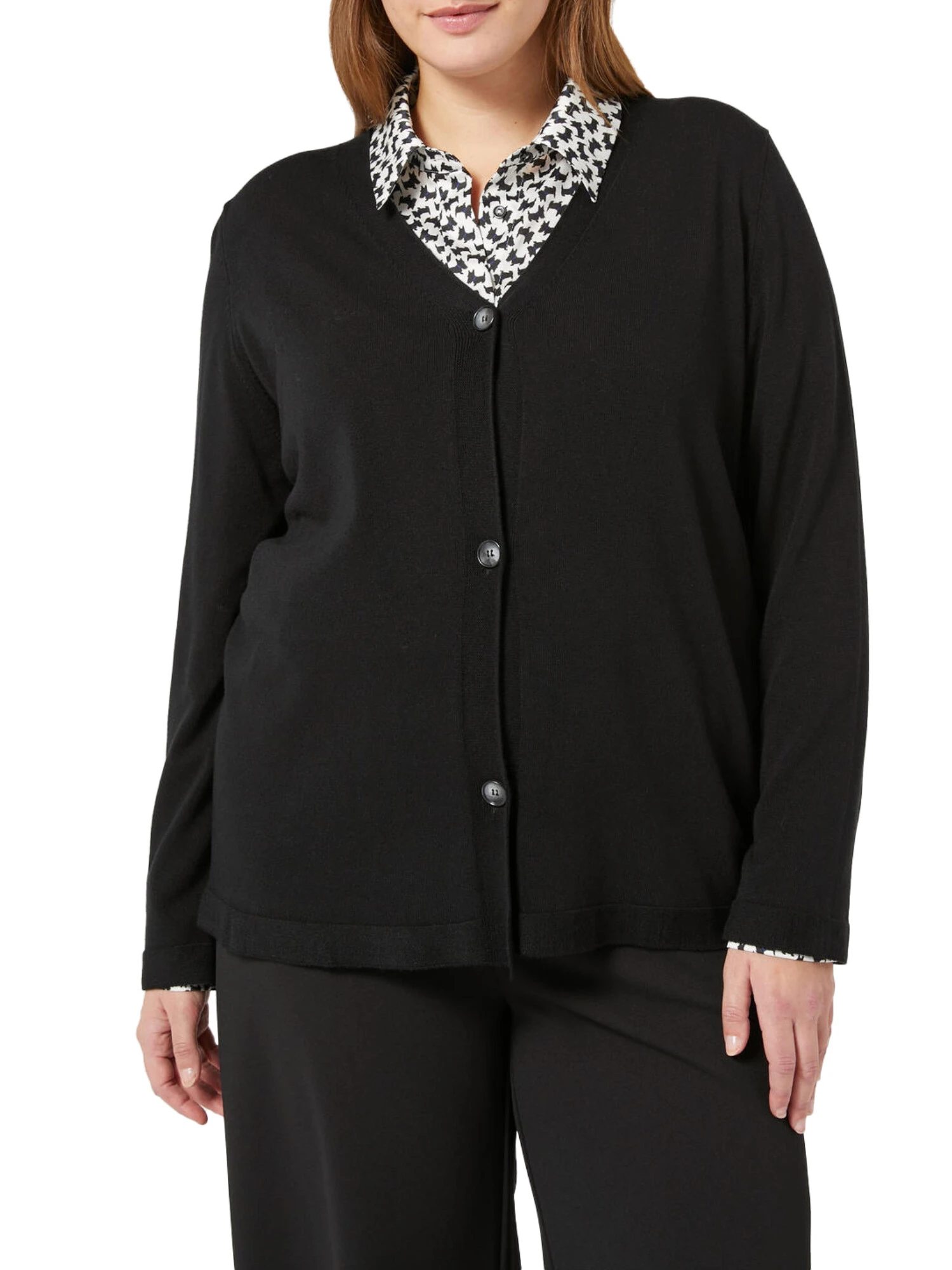 Questo cardigan della collezione Persona by Marina Rinaldi è realizzato in misto viscosa stretch, offrendo comfort e stile. Presenta un classico colore nero con righe bianche orizzontali, uno scollo a V e tre bottoni frontali per una chiusura pratica. Il design a righe aggiunge un tocco dinamico, rendendolo perfetto per completare qualsiasi outfit, dal casual al formale.